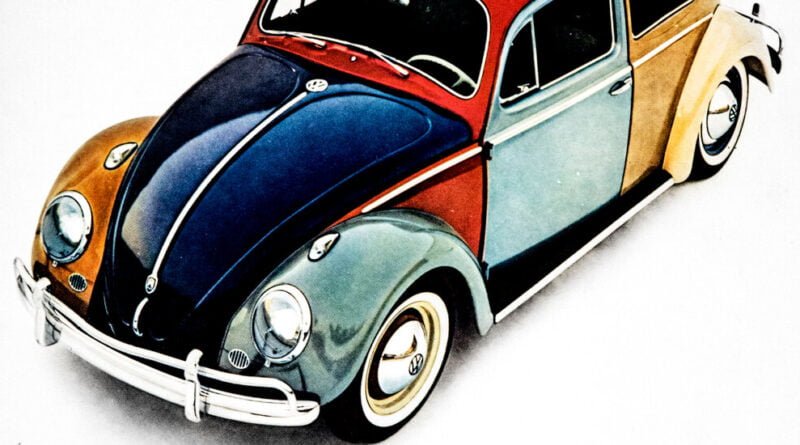 The pair also devised an ad that showed a motley Beetle constructed of green and beige fenders, a blue hood and a turquoise door, which were cobbled together from models between 1958 and 1964. The ad stressed the ease with which owners could find parts.