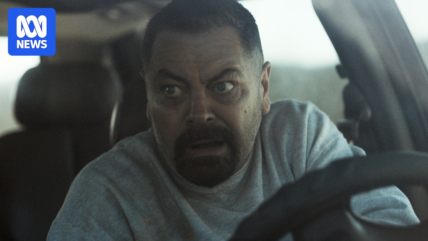 A film still of Nick Offerman, 55, with a closely shaved head and goatee, looking panicked behind the wheel of a car.